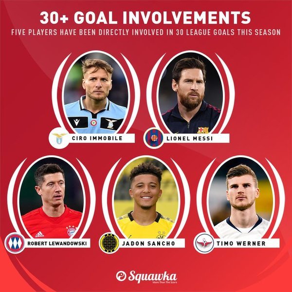5 graczy było bezpośrednio zaangażowanych w 30 bramek ligowych w pięciu najlepszych ligach europejskich w tym sezonie: