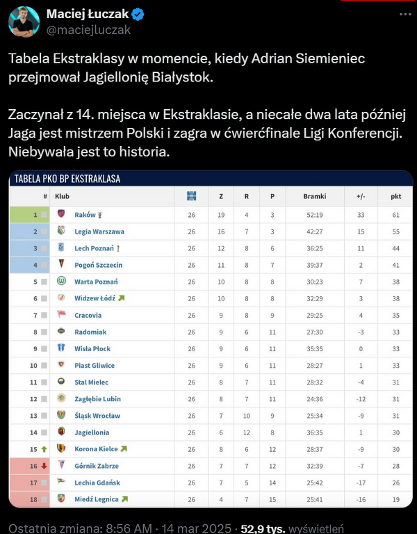 Adrian Siemienic wykonał niesamowitą pracę w Jagiellonii