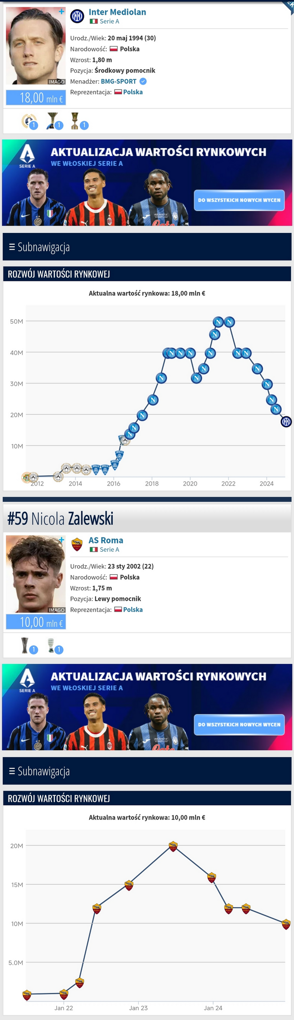 Aktualna wartość Zielińskiego i Zalewskiego po ostatniej aktualizacji cen na portalu transfermarkt