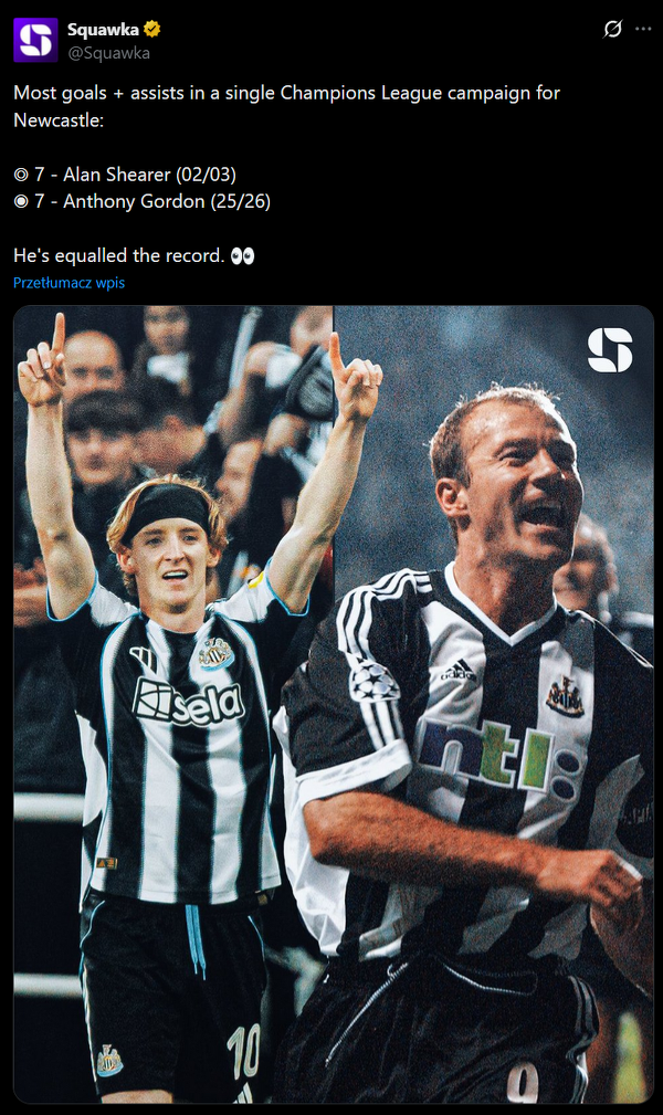 Anthony Gordon wyrównał klubowy rekord Alana Shearera z sezonu 2002/03, w liczbie strzelonych goli i zdobytych asyst