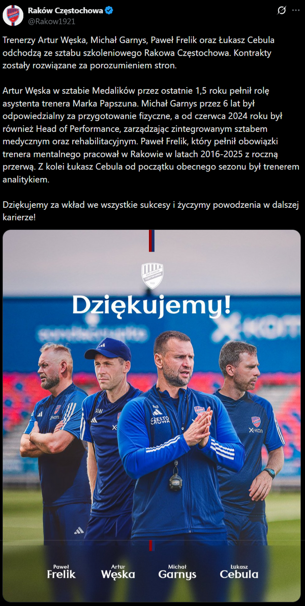 Artur Węska, Michał Garnys, Paweł Frelik oraz Łukasz Cebula odchodzą ze sztabu szkoleniowego Rakowa