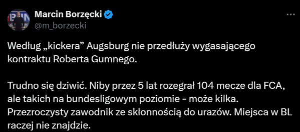Augsburg nie przedłuży kontraktu z Robertem Gumnym