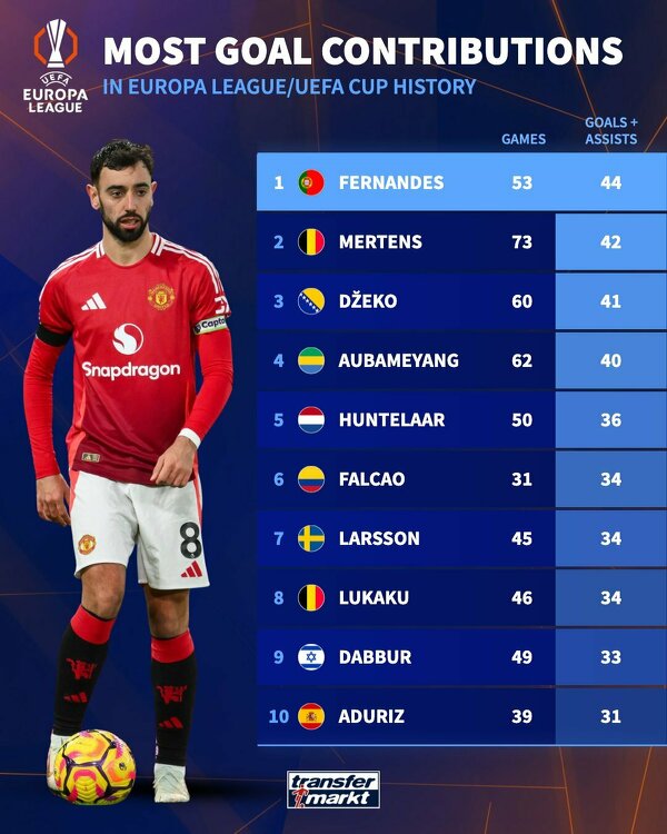 Bruno Fernandes liderem klasyfikacji kanadyjskiej w całej historii Ligi Europy/Pucharu UEFA