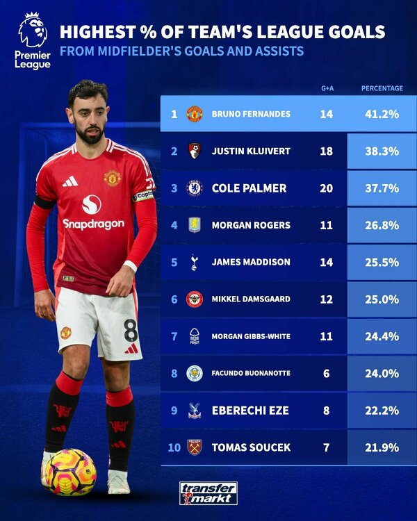 Bruno Fernandes strzelił ponad 40% wszystkich goli Man Utd w tym sezonie PL