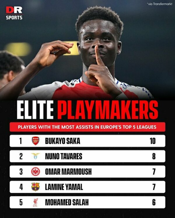 Bukayo Saka jako pierwszy zawodnik z lig TOP 5 osiągnął dwucyfrową liczbę asyst w tym sezonie