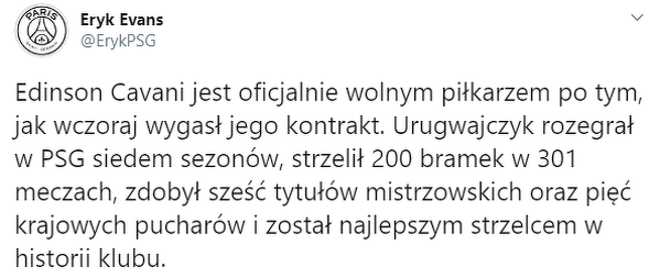 Cavani oficjalnie wolnym zawodnikiem
