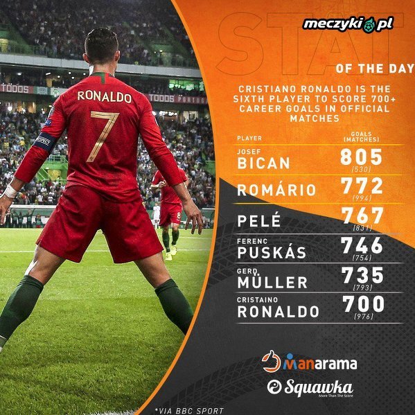 Cristiano Ronaldo jest szóstym graczem, który strzelił ponad 700 bramek kariery w oficjalnych meczach