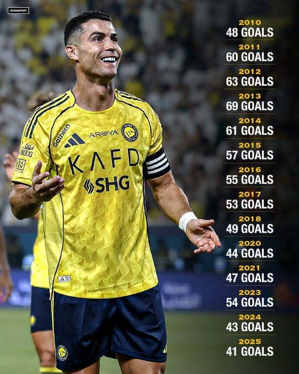 Cristiano Ronaldo po raz 14. w karierze strzelił co najmniej 40 goli w jednym roku kalendarzowym