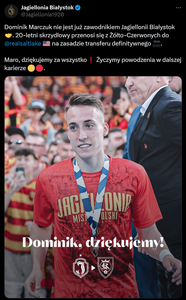 Dominik Marczuk z Jagiellonii przeniósł się do Realu Salt Lake