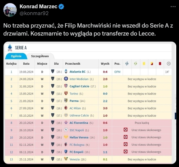 Dramatyczna sytuacja Filipa Marchwińskiego w Lecce