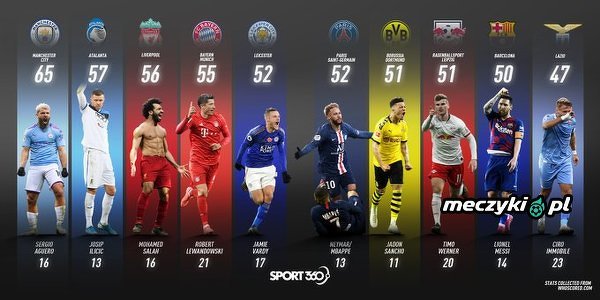 Drużyny z największą liczbą punktów z 5 najlepszych lig i ich najlepszy strzelec