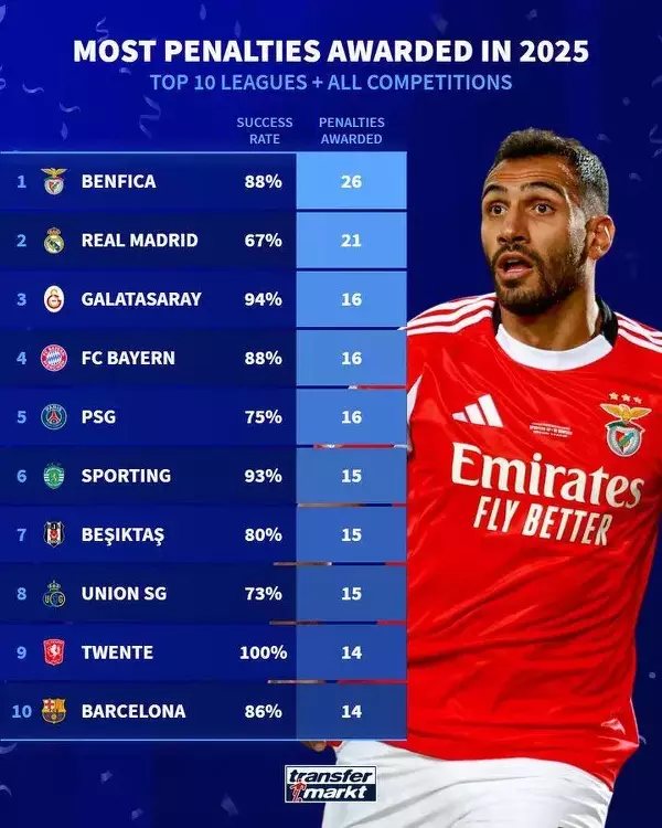Drużyny z największą liczbą rzutów karnych w 2025 roku