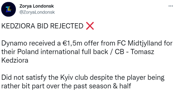 Dynamo Kijów odrzuciło ofertę za Kędziorę