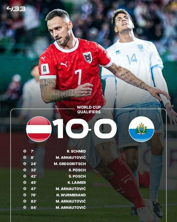 Dzisiejsza wygrana Austrii z San Marino jest najwyższą w historii meczów austriackiej reprezentacji
