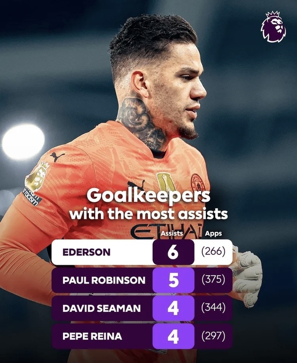 Ederson ma najwięcej asyst z pośród bramkarzy w Premier League