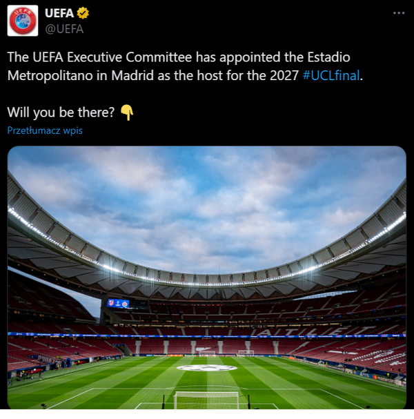 Estadio Metropolitano gospodarzem finału Ligi Mistrzów w 2027 roku