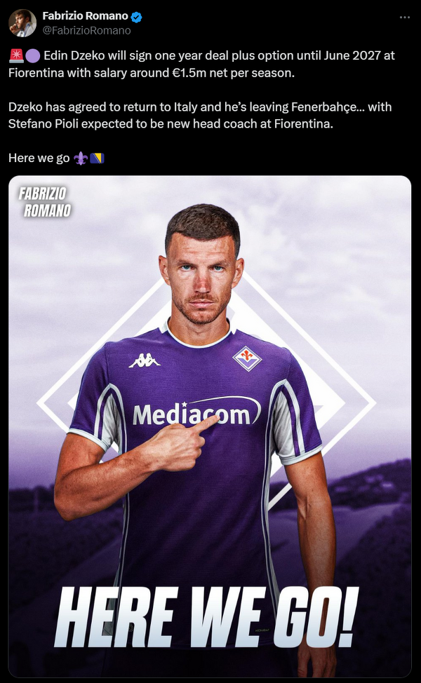 Fabrizio Romano: Edin Dzeko zostanie piłkarzem Fiorentiny