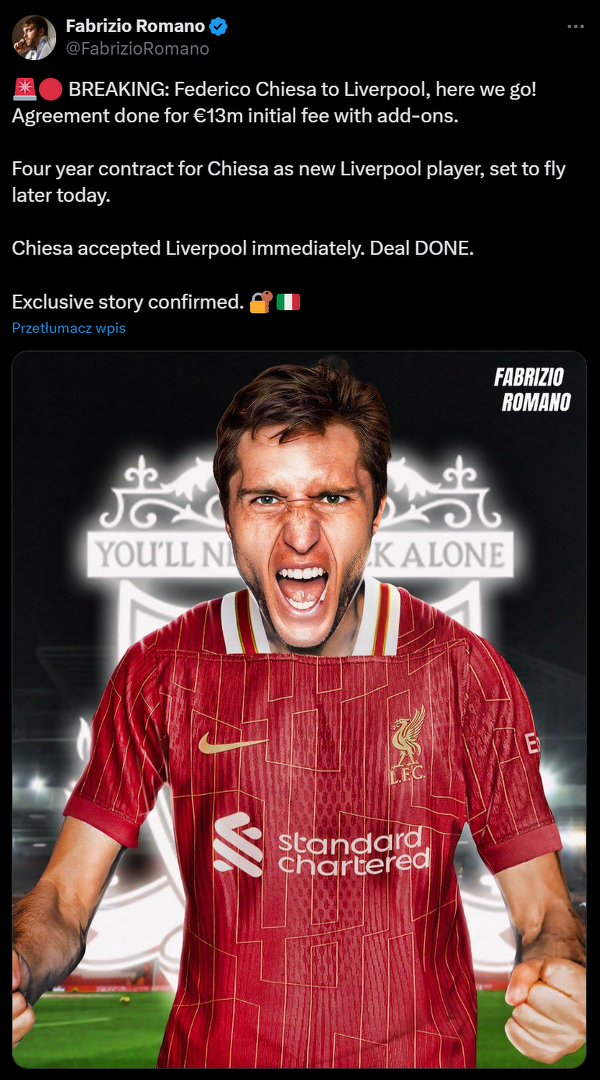 Fabrizio Romano: Frederico Chiesa zostanie piłkarzem Liverpoolu