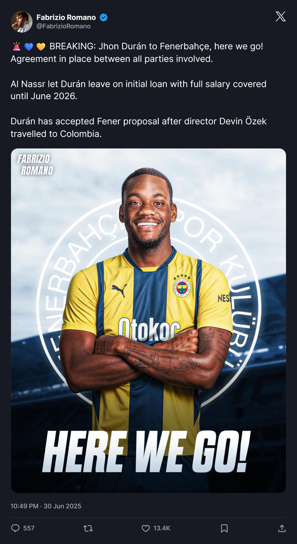 Fabrizio Romano: Jhon Duran zostanie piłkarzem Fenerbahce