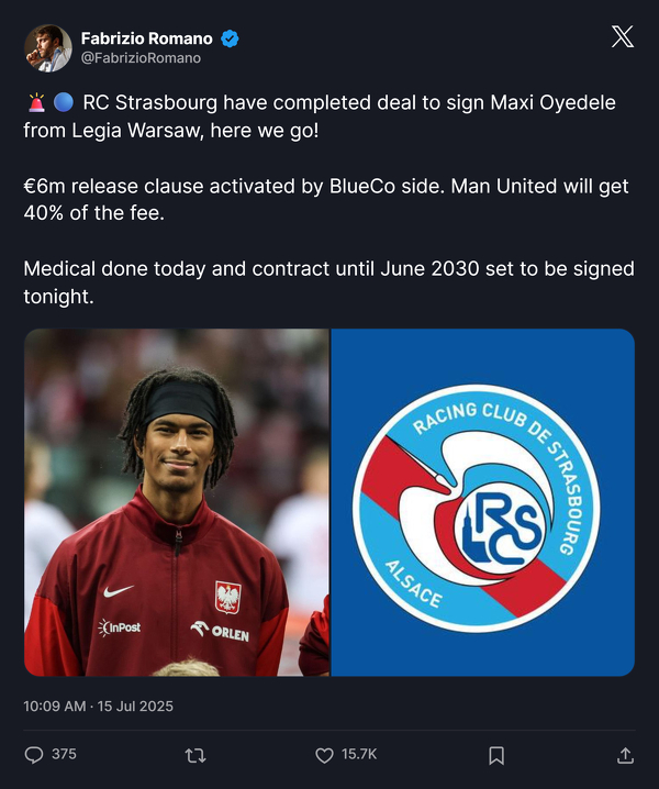 Fabrizio Romano: Oyedele podpisze 5-letni kontrakt z RC Strasbourg