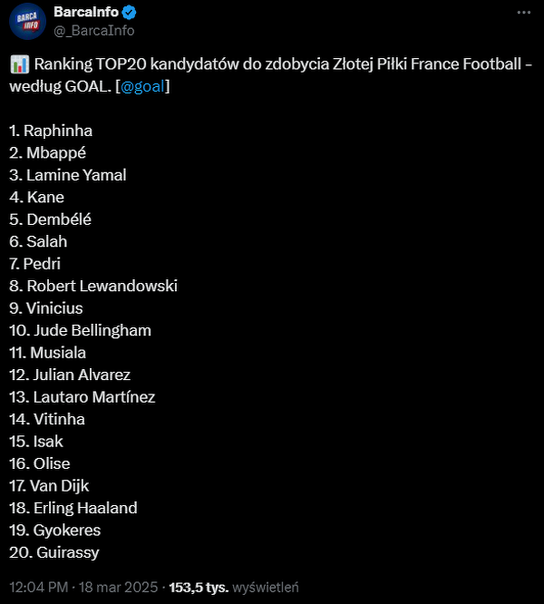 Faworyci do Złotej Piłki według portalu "Goal.com"