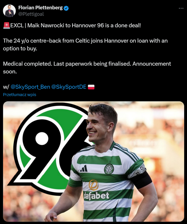 Florian Plettenberg: Maik Nawrocki zostanie wypożyczony z Celtiku do Hannoveru 96
