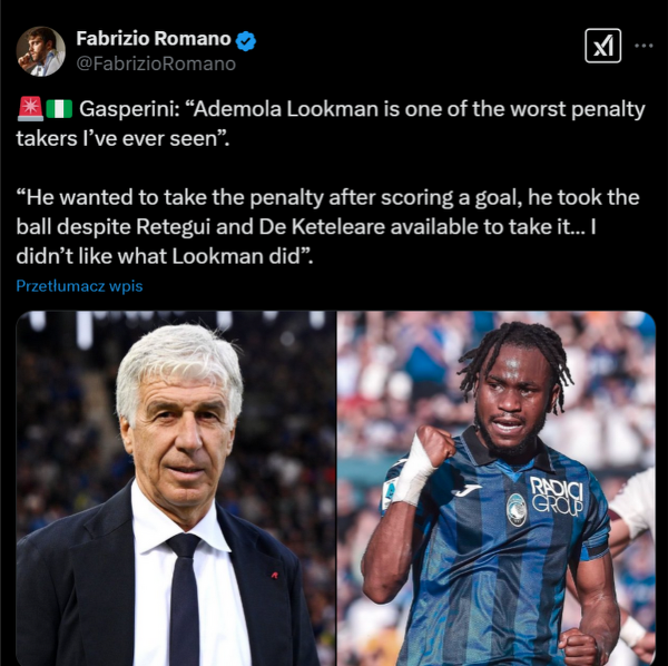 Gasperini o zmarnowanym rzucie karnym przez Lookmana