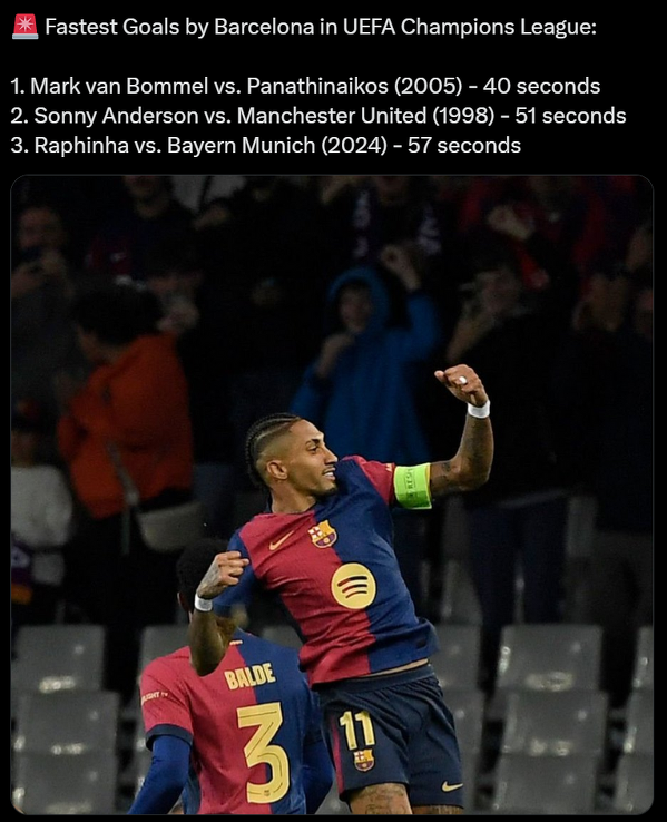 Gol Raphinhii to trzecia najszybciej strzelona bramka przez zawodnika Barcelony w historii LM