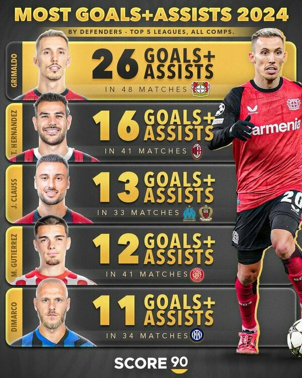 Grimaldo zdecydowanym liderem klasyfikacji kanadyjskiej za rok 2024 wśród obrońców z TOP 5 lig Europy