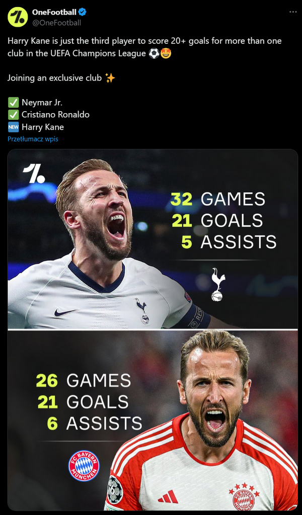 Harry Kane został trzecim piłkarzem, który zdobył co najmniej 20 goli dla więcej niż jednego klubu w LM
