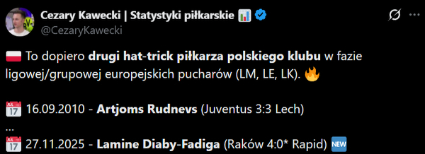 Hat-trick zawodnika polskiego klubu w fazie ligowej/grupowej europejskich pucharów