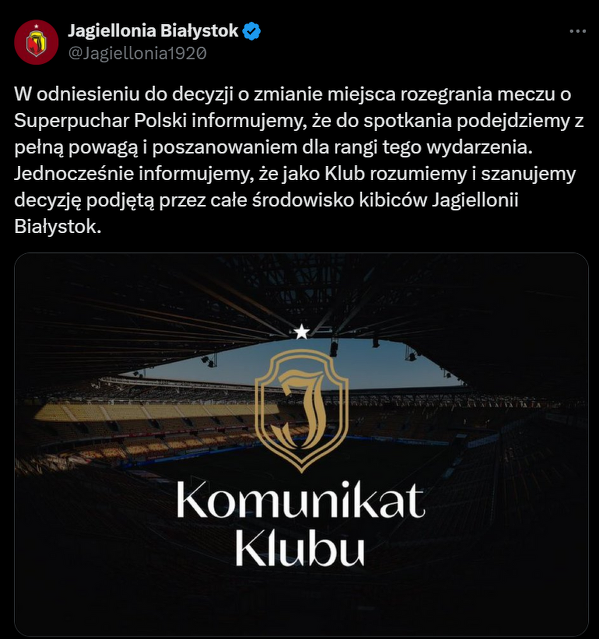 Jagiellonia Białystok odniosła się do decyzji PZPN odnośnie rozegrania meczu o Superpuchar Polski na Stadionie Narodowym