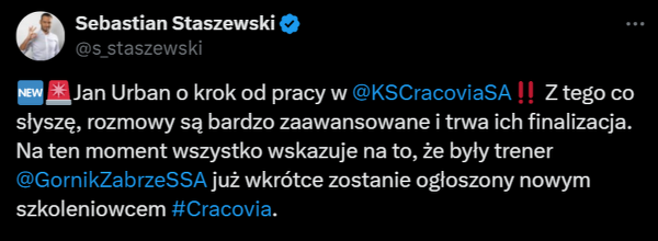 Jan Urban blisko objęcia Cracovii