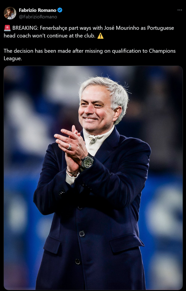 Jose Mourinho nie jest już trenerem Fenerbahce
