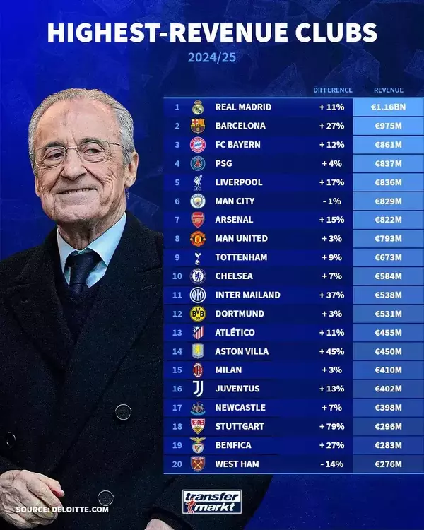 Kluby, które zanotowały najwyższe przychody w sezonie 2024/25