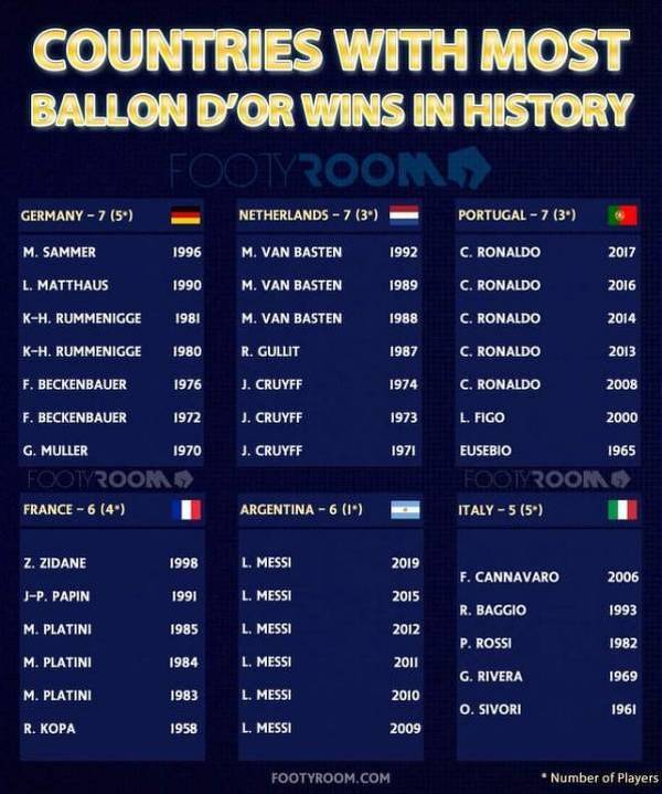 Kraje z największą liczbą zdobywców Złotej Piłki