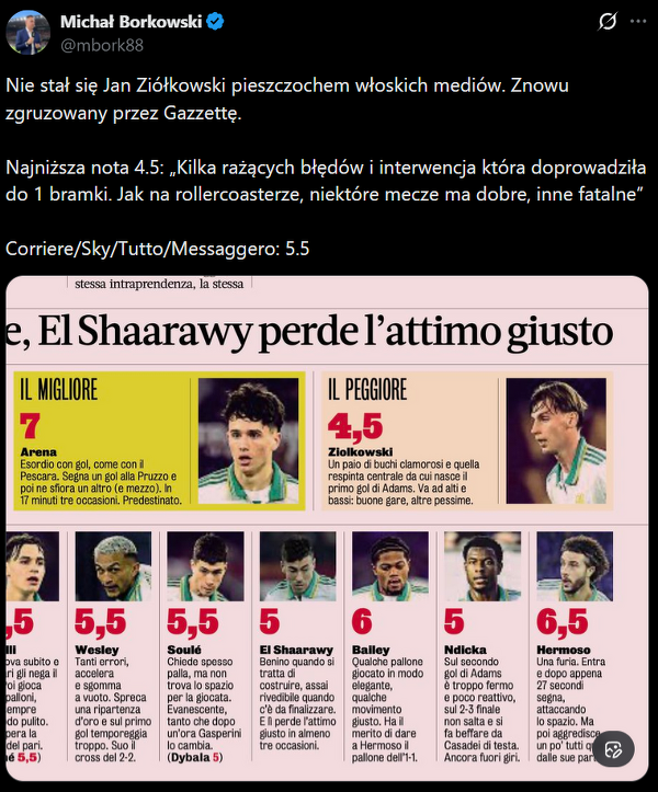 "La Gazzetta dello Sport" bezlitosna dla Ziółkowskiego
