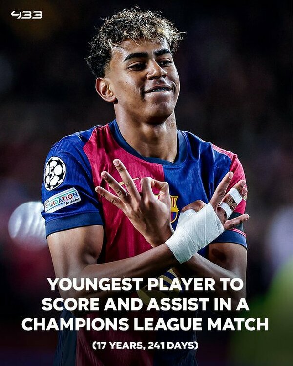 Lamine Yamal został najmłodszym piłkarzem w historii Ligi Mistrzów, który w jednym meczu strzelił gola i zanotował asystę