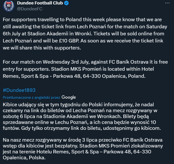 Lech Poznań sprzedaje bilety na sparing z Dundee po 10 funtów