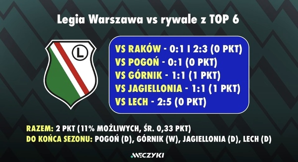 Legia z drużynami z TOP 6 Ekstraklasy zdobyła tylko jeden punkt