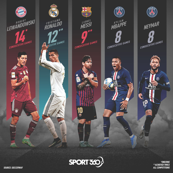 Lewandowski jest liderem wśród tych współczesnych mistrzów w kolejnych meczach strzelania bramek