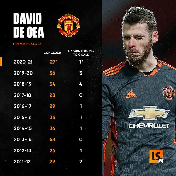 Liczba straconych goli i błędów skutkujących golem De Gei w barwach United