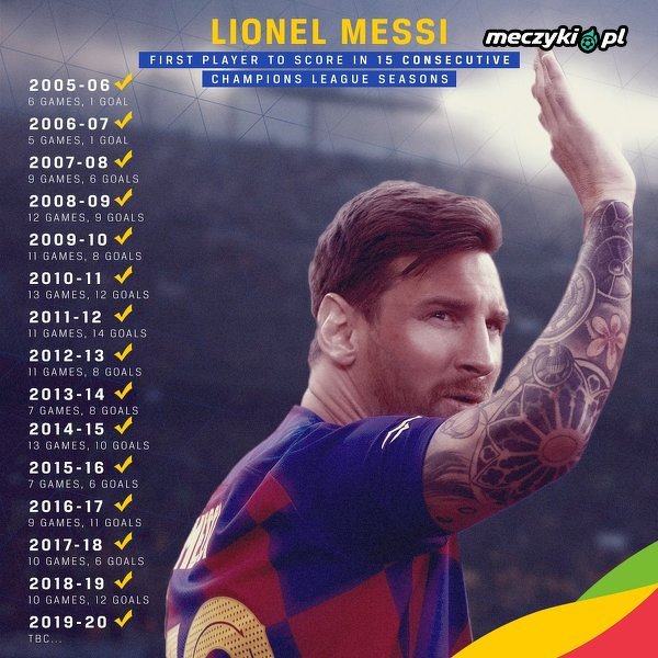 Lionel Messi jest pierwszym zawodnikiem, który strzeli bramkę w 15 kolejnych meczach Ligi Mistrzów