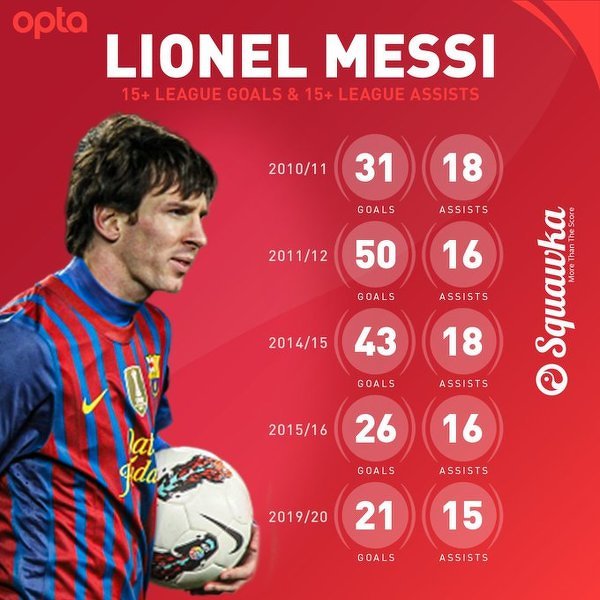 Lionel Messi strzelił ponad 15 bramek i zapewnił 15+ asyst w jednym sezonie LaLiga po raz piąty w swojej karierze: