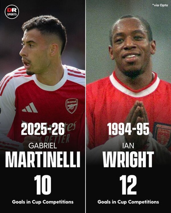 Martinelli to pierwszy gracz Arsenalu od czasów Wirighta (94/95), który strzelił 10+ goli w pucharach w jednym sezonie