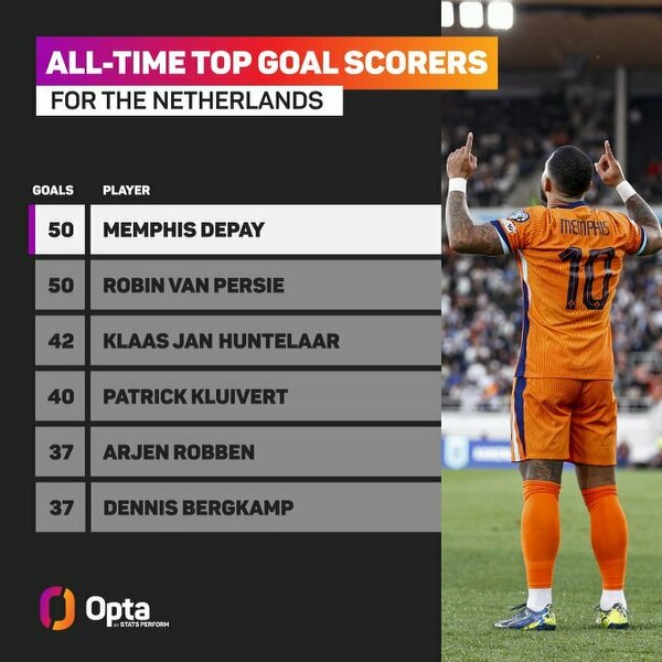 Memphis Depay zrównał się z Robinem Van Persie w liczbie goli dla reprezentacji Holandii