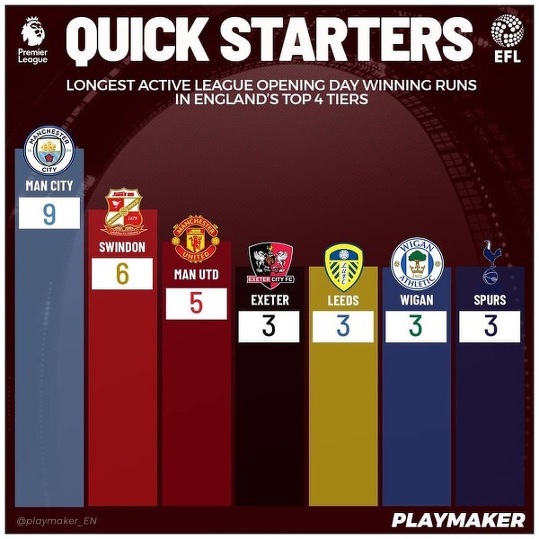 Najdłuższe aktywne serie zwycięstw angielskich klubów w premierowych kolejkach na zawodowym szczeblu