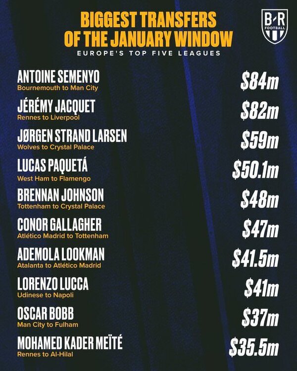Najdroższe transfery zimowego okienka transferowego (kwoty w dolarach amerykańskich)