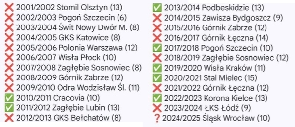 Najgorzej punktujące drużyny w Ekstraklasie po 17. kolejce w XXI wieku