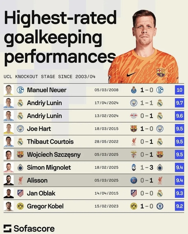 Najlepiej oceniane występy bramkarzy w LM od sezonu 2003/04 przez portal Sofascore